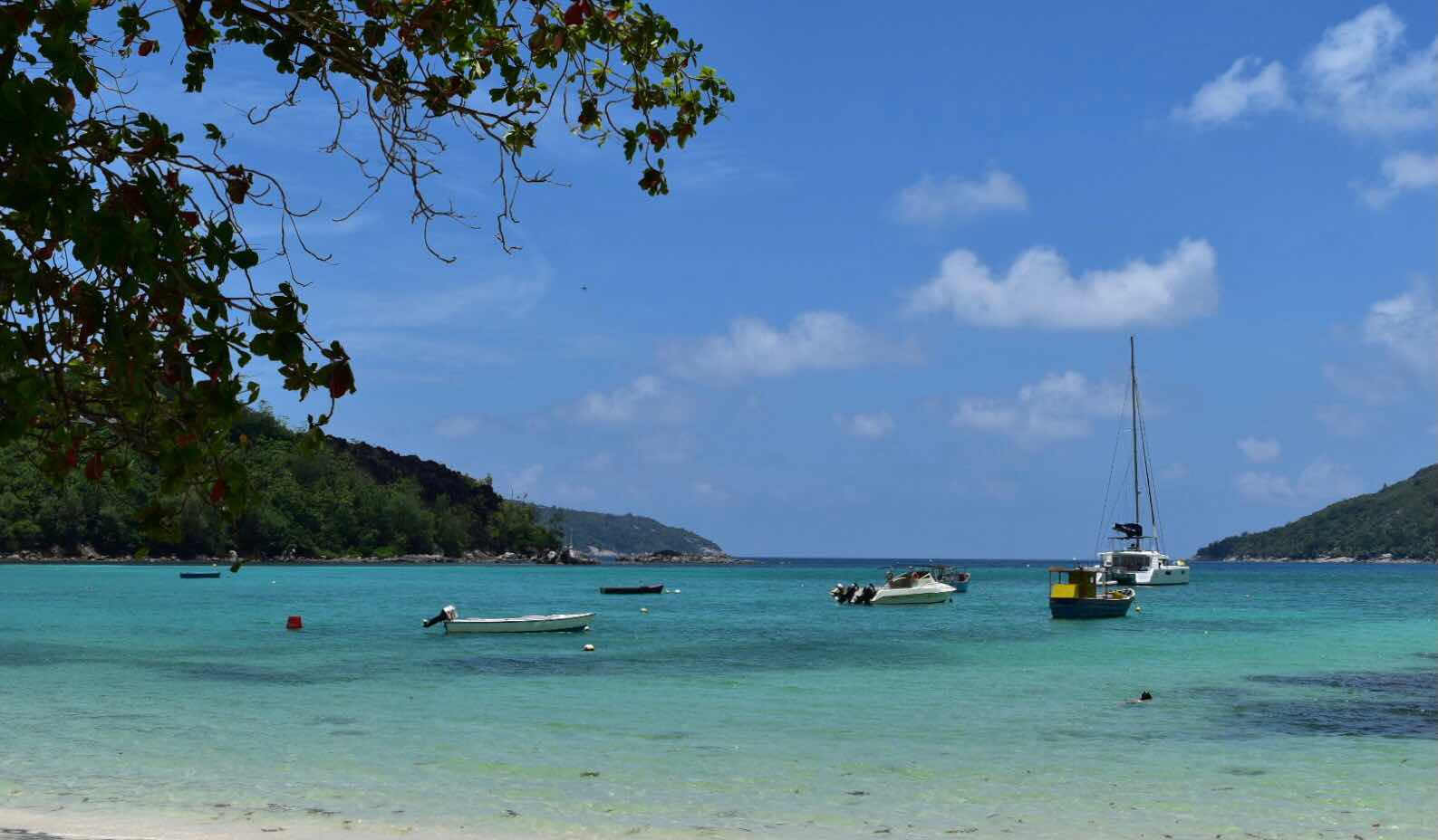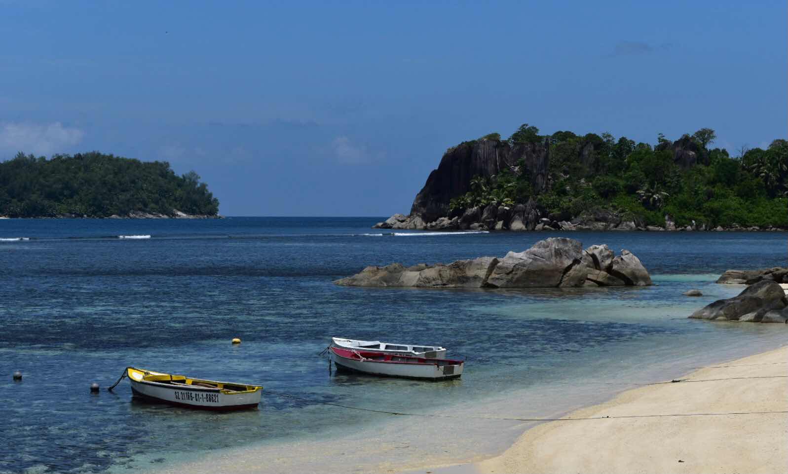 Boats in Port Glaud. Therese Island is on the left and the island on the right was used until 2020 as the setting of the Russian reality show, “House 2”. The world’s longest running reality show with over 3000 episodes, in the show, contestants are building a house and trying to find someone to love in the process. Couples then compete for the house itself.